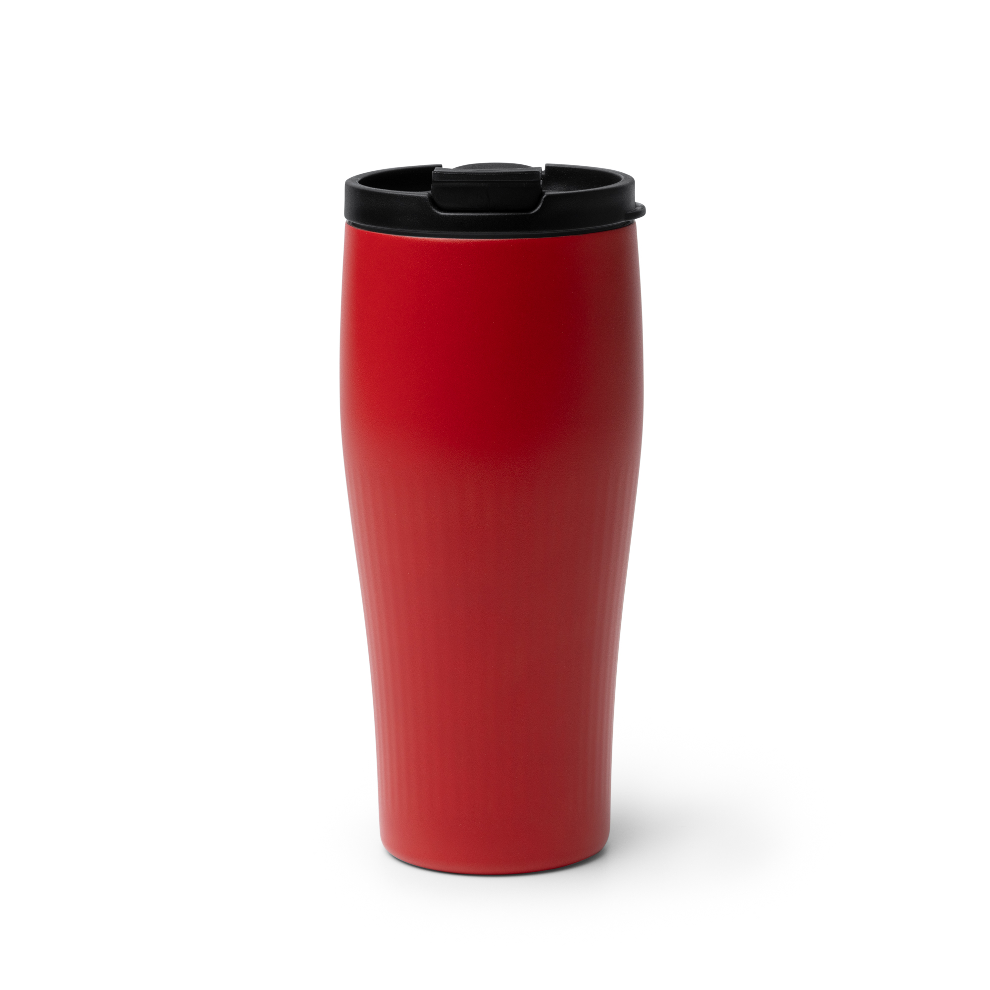 Vaso térmico diseño curvado elaborado en acero inoxidable 304 reciclado. Con doble pared, acabado mate y textura ribeteada en su parte inferior. Con capacidad para 500 ml. Cuenta con tapa a rosca y apertura abatible con boquilla en color negro.