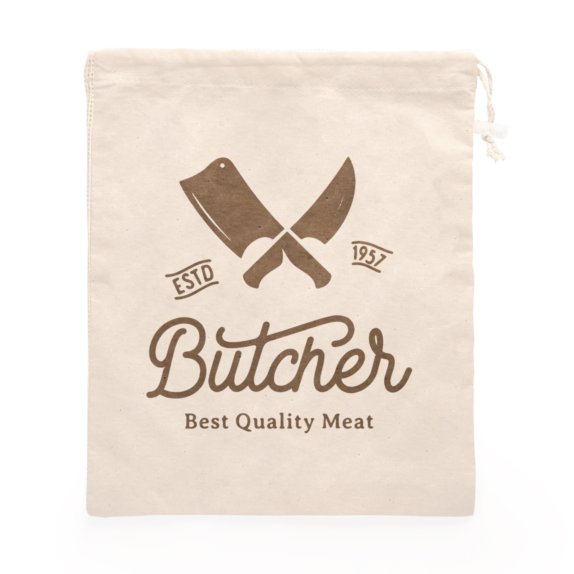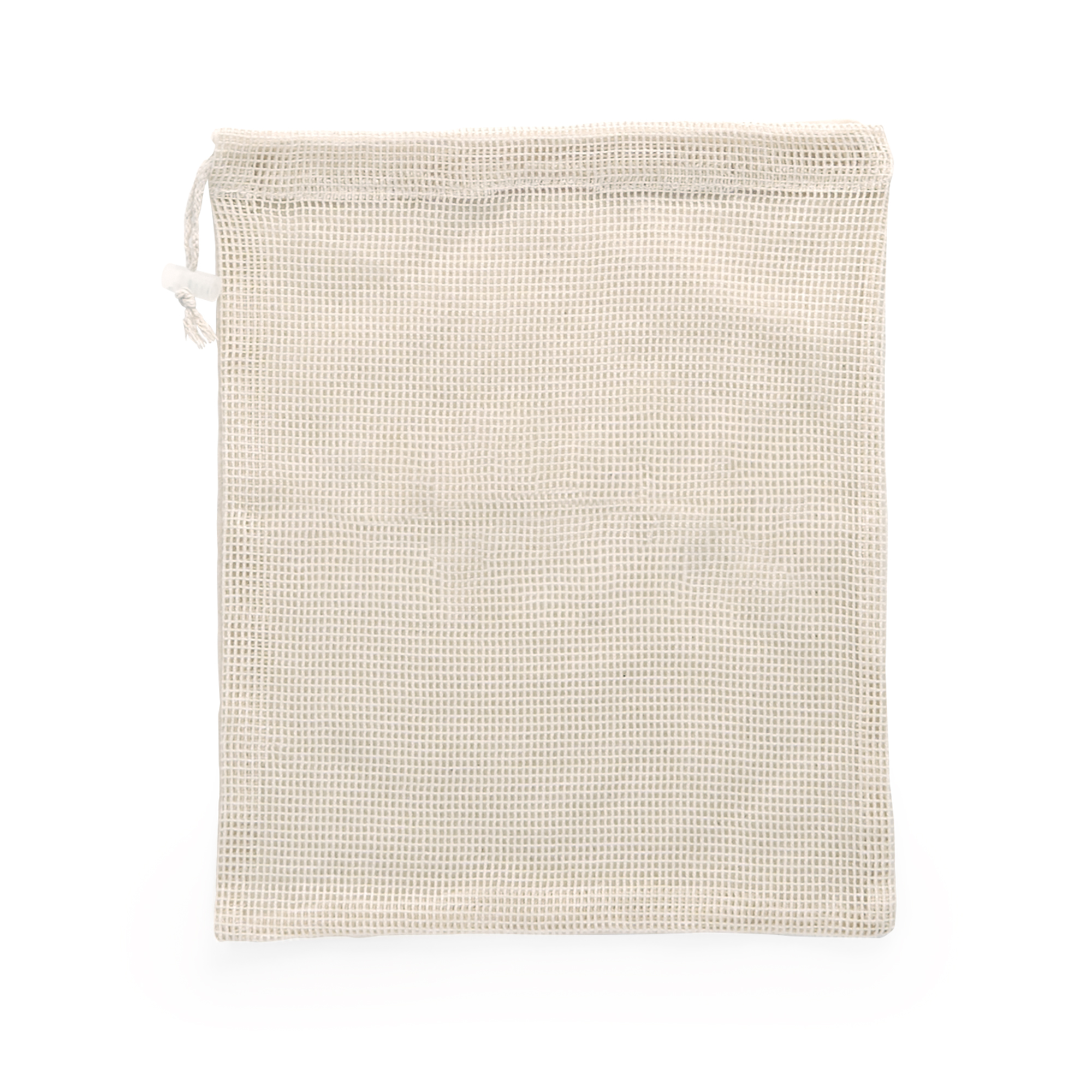 Bolsa multiusos ideal para la compra, de línea eco 100% algodón en color natural. Un lado de la bolsa en algodón suave y otro lado en ligera rejilla. Cierre de cordón y ajustador de plástico transparente.