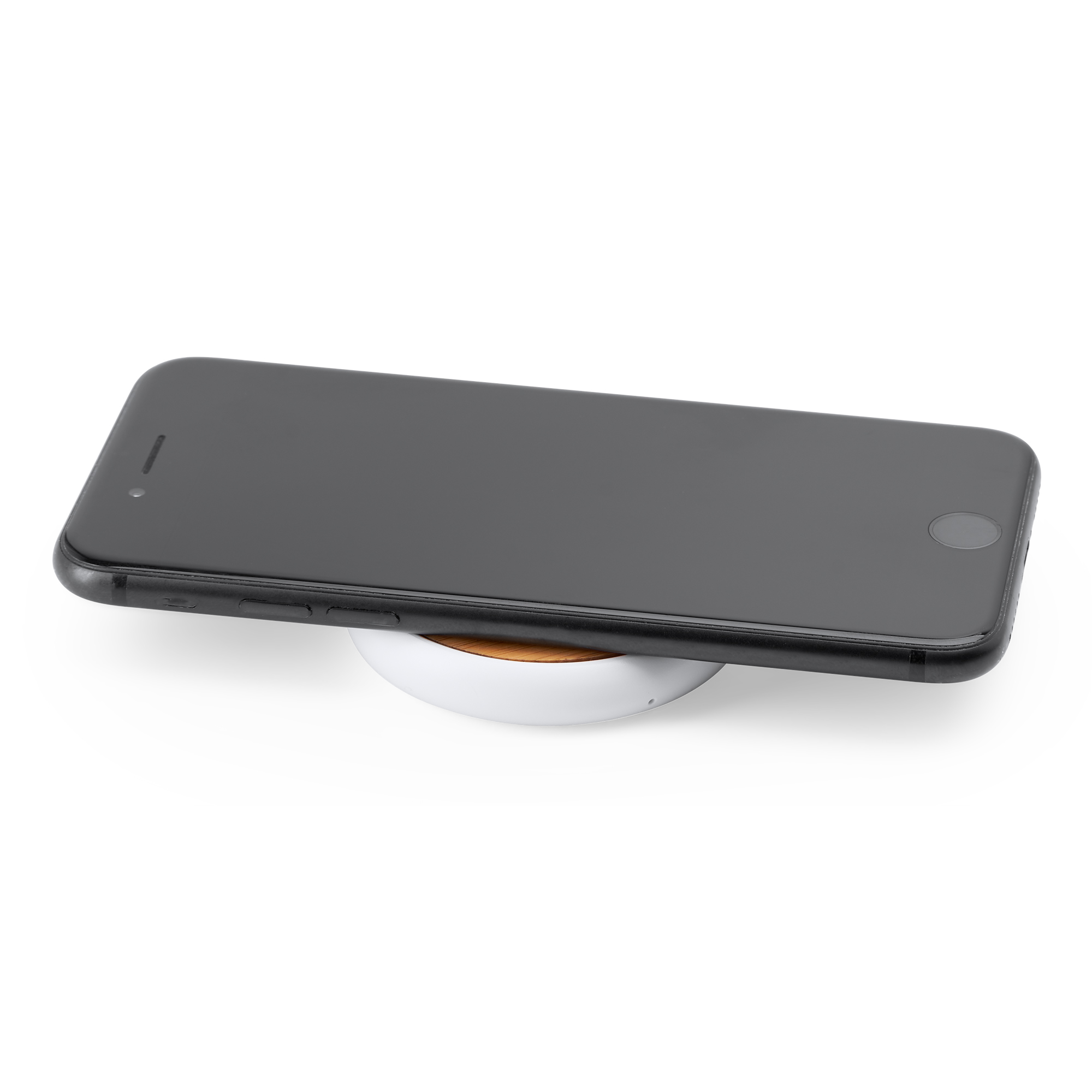Cargador inalámbrico elaborado en de ABS blanco con superficie de carga en bambú. Con 5W de potencia. Con puerto de salida Tipo C. Cuenta con indicador luminoso de confirmación de carga. Compatible con dispositivos móviles provistos de tecnología de este tipo de carga.
