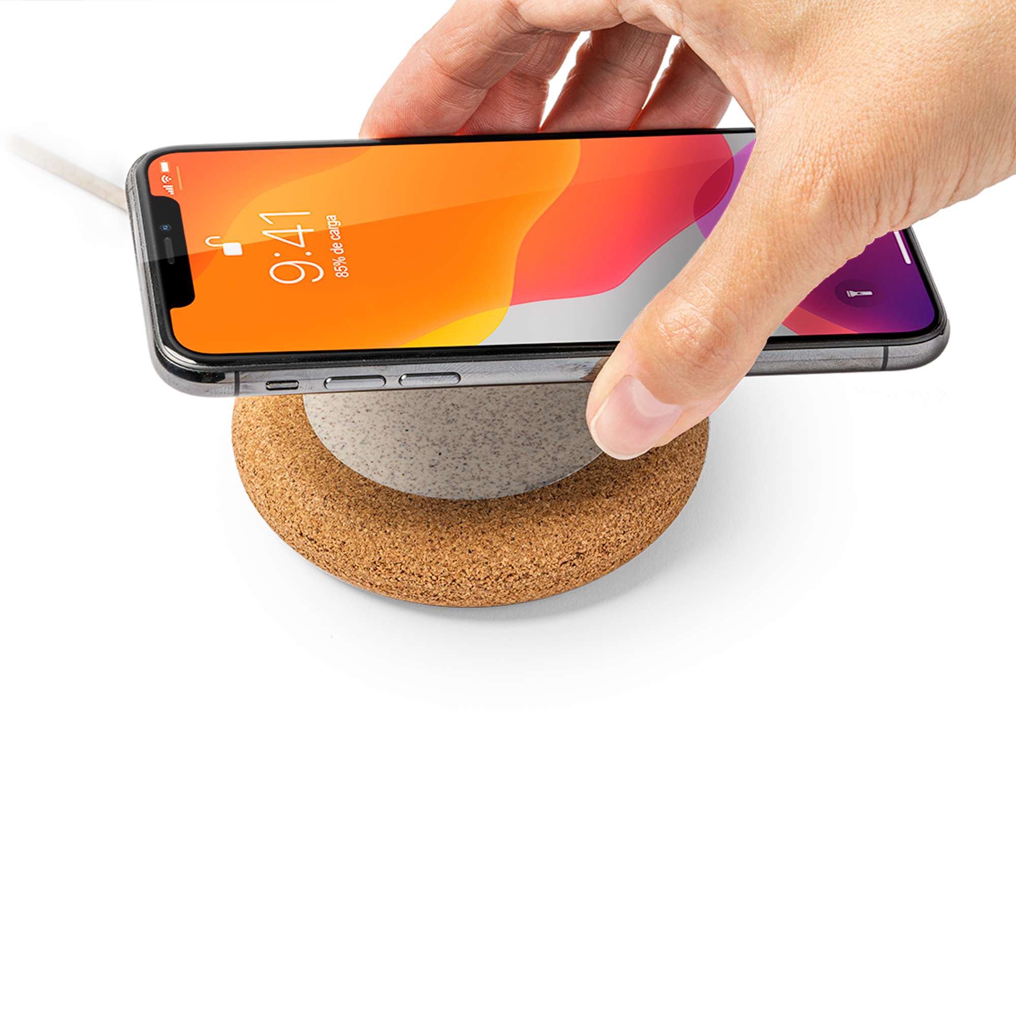 Cargador inalámbrico con cuerpo de corcho natural y fibra de trigo. Con potencia de 15W. Cuenta con indicador luminoso de carga. Compatible con dispositivos provistos de tecnología de carga inalámbrica. Cable de conexión, con diseño eco, integrado.