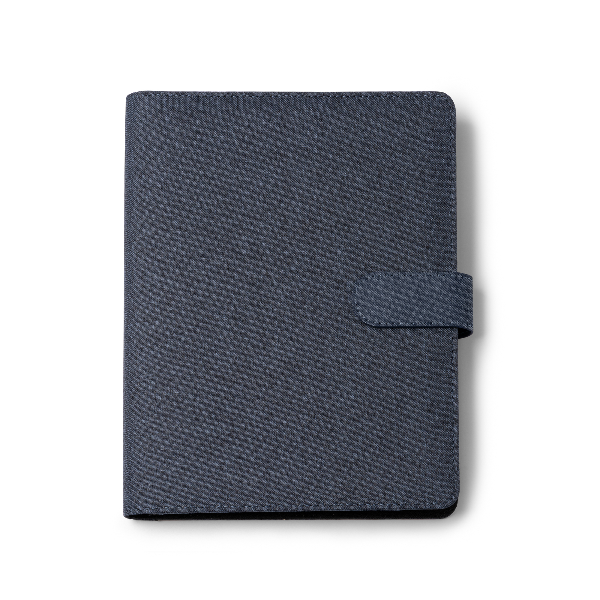 Carpeta multiusos realizada en RPET. Tiene un tamaño A5 y cuenta con cierre magnético. Incluye, además, un bloc de notas extraíble de 80 hojas a rayas. Cuenta con 3 compartimentos principales interiores, 2 tarjeteros interiores y soporte para bolígrafo.
