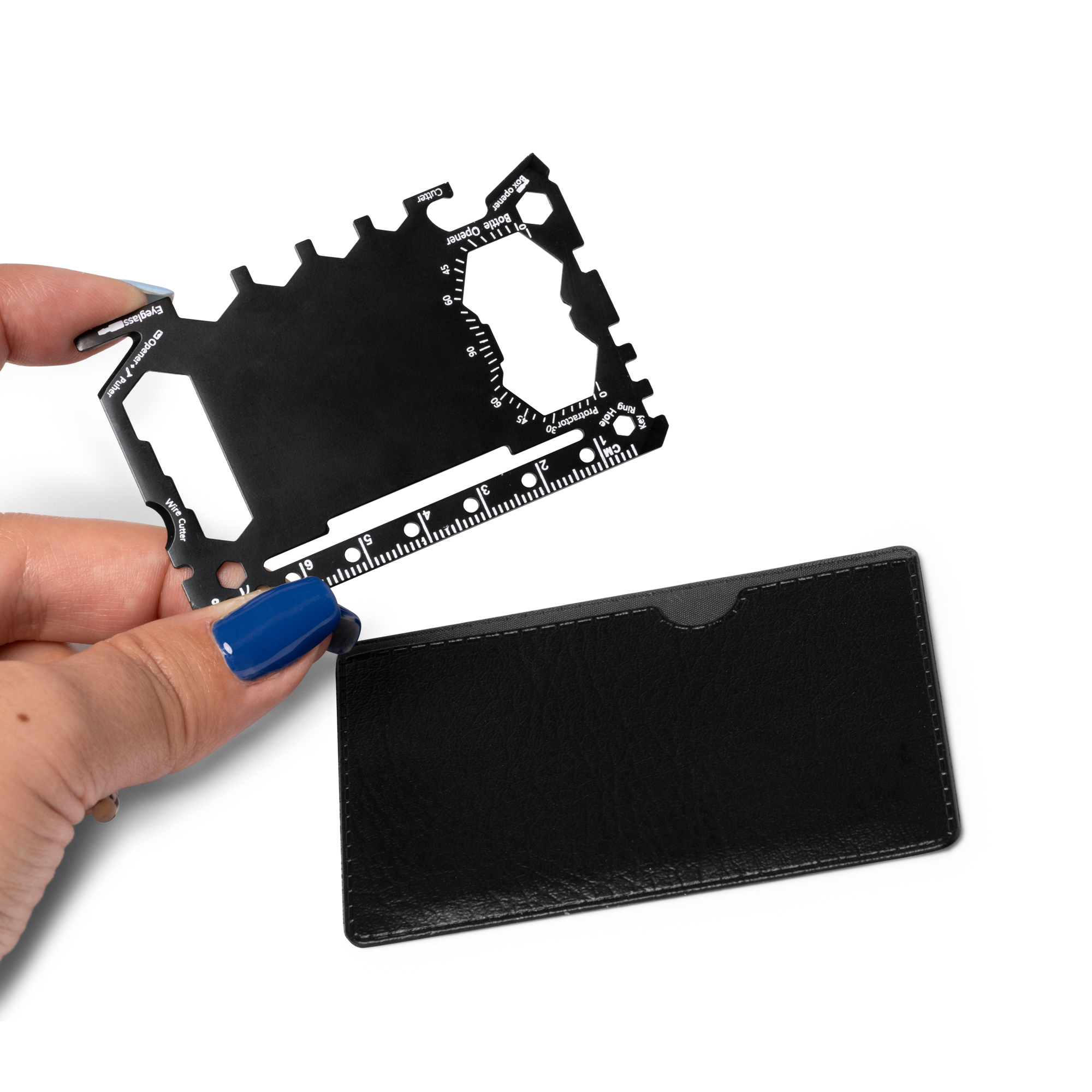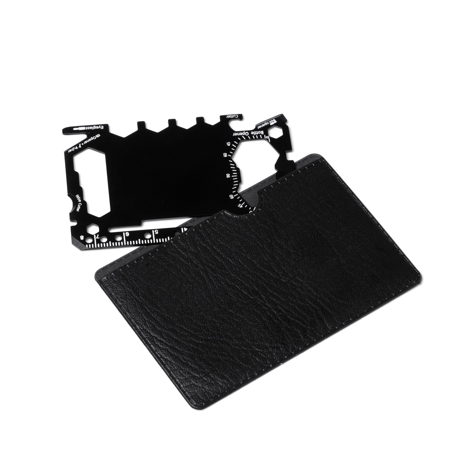 Multiherramienta de acero inoxidable. 17 funciones integradas. Versátil herramienta que incluye: abrelatas, cuchillo afilado, destornillador, regla, abrebotellas, llaves inglesas, llaves de mariposa, sierra, indicador de dirección y transportador de ángulos. Presentado en funda de PU.