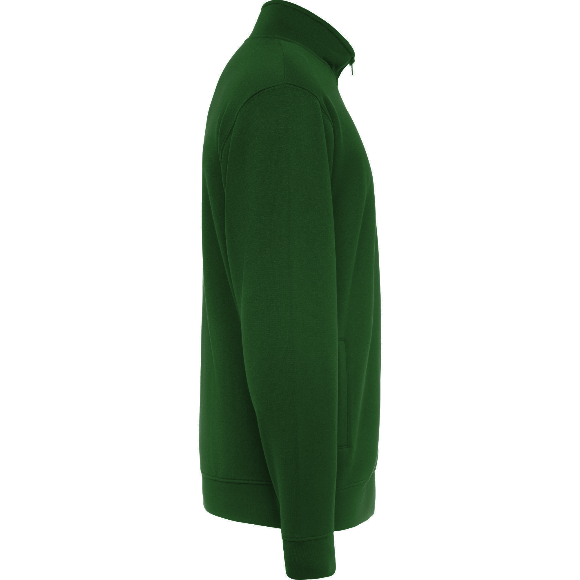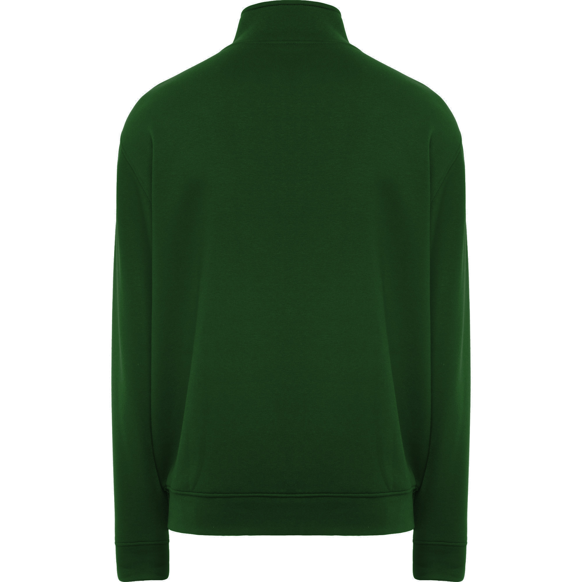 Sudadera unisex con cremallera frontal y cuello alto. Cremallera al tono. Dos bolsillos laterales con ribete del mismo tejido. Puños y cinturilla en canalé 2×1 con elastano. Cubrecosturas del mismo tejido.