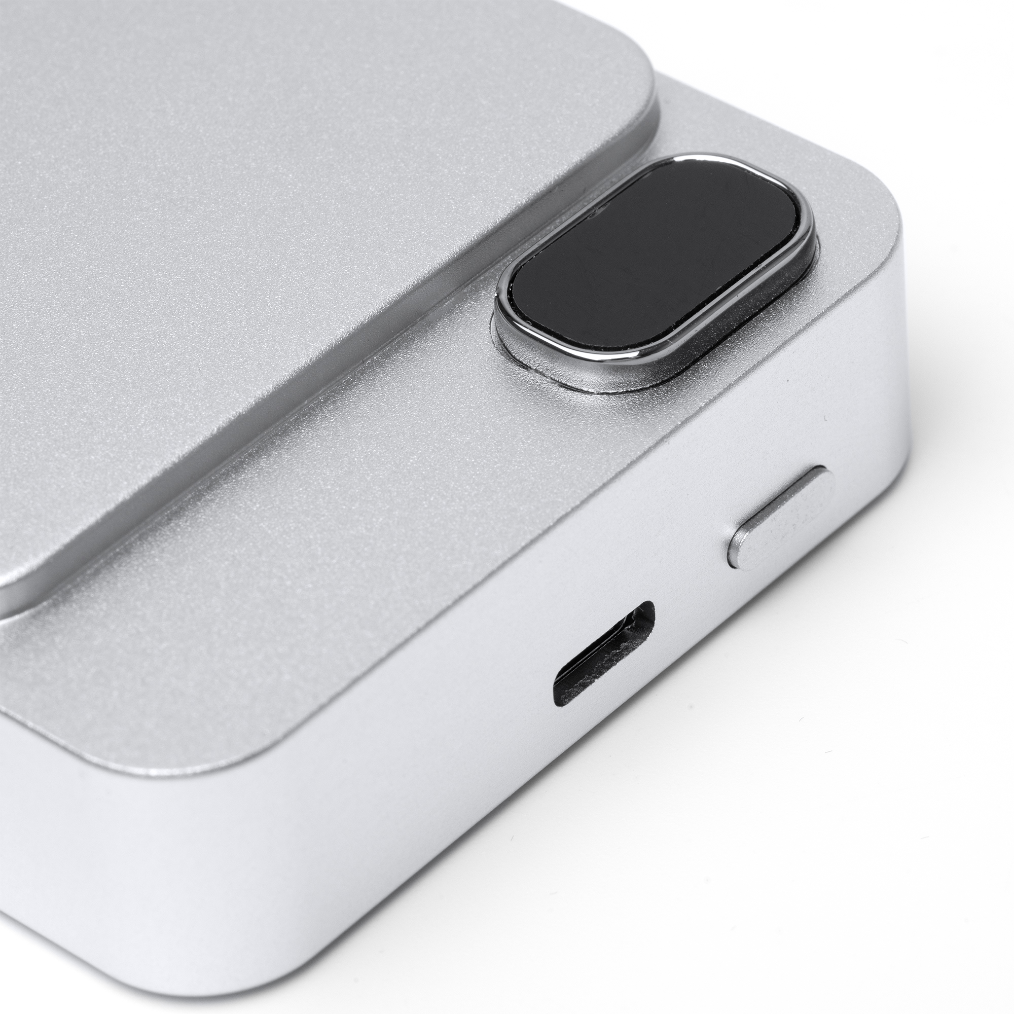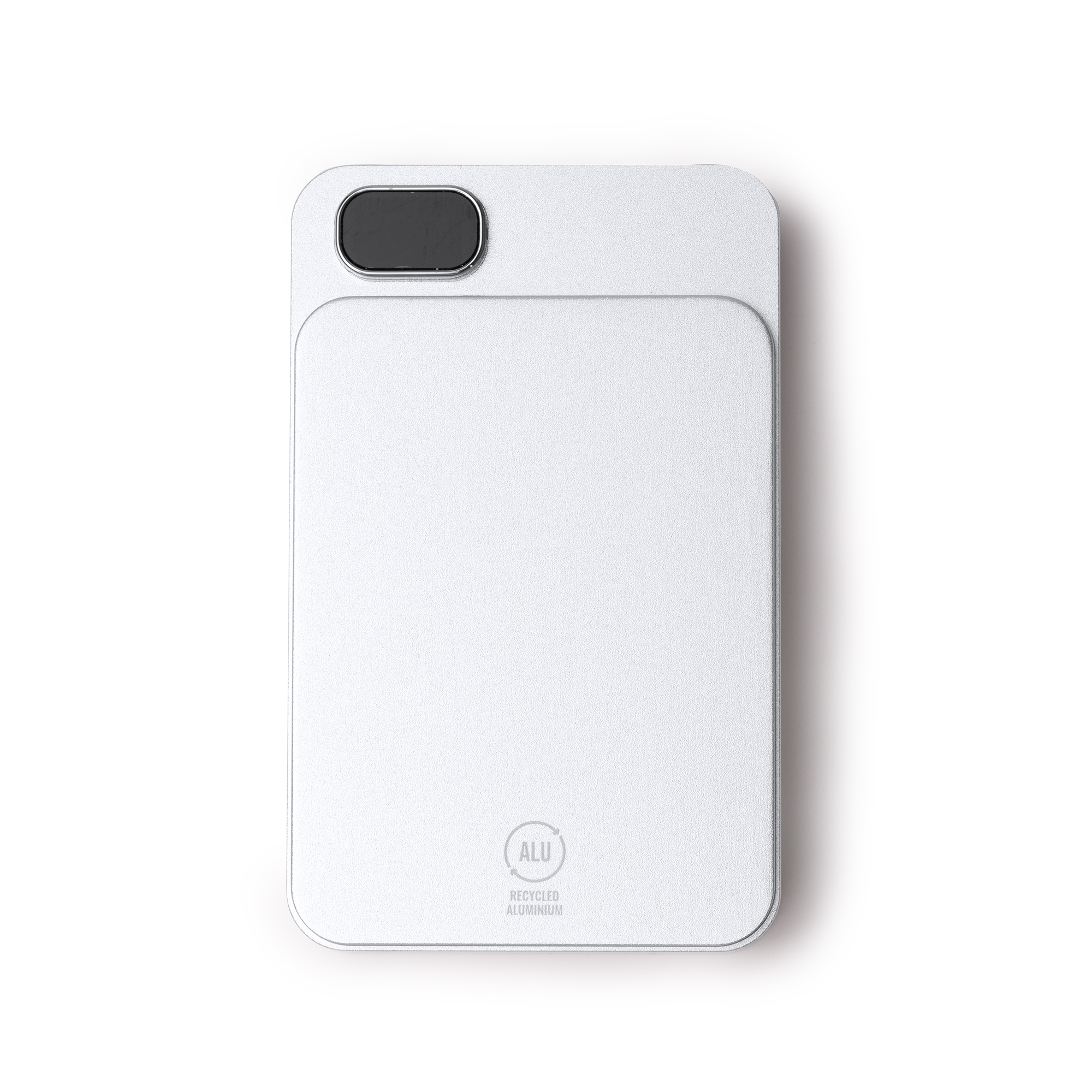Batería externa magnética de 10000 mAh con cuerpo de aluminio reciclado. Con función de carga inalámbrica para dispositivos provistos de esta tecnología. Pantalla LED con indicador de porcentaje de carga. Puerto Tipo C de entrada y salida. Salida corriente 15W. Incluye cable tipo C y anillo magnético.