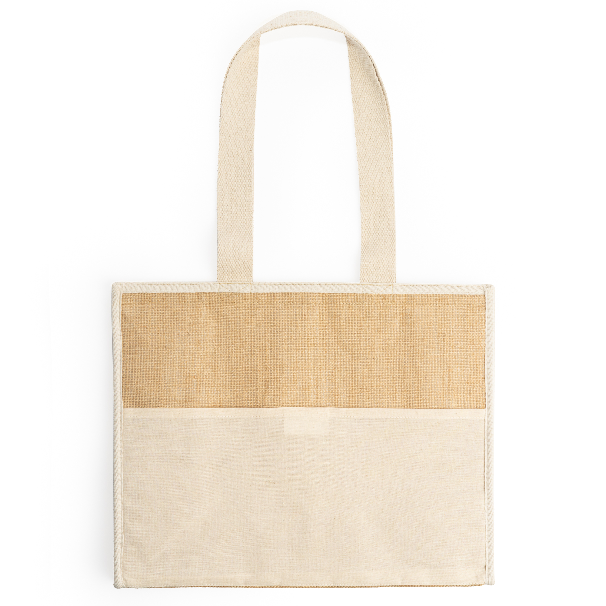 Bolsa nevera de yute laminado. Interior isotérmico de aluminio con cierre de velcro. Mantén tu comida y bebida en buena temperatura. Bolsillo frontal y asas en algodón natural.