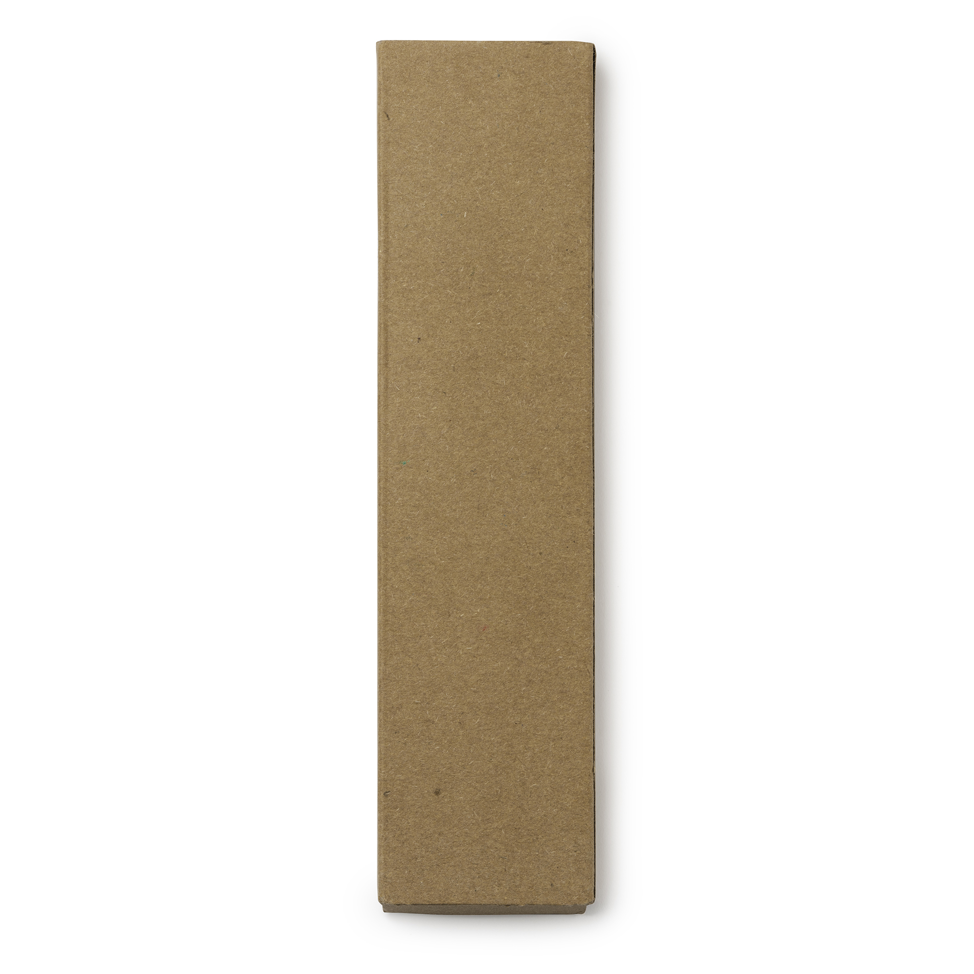 Set de escritura de madera natural presentado en estuche de cartón kraft. Incluye los productos fundamentales: regla, 3 lápices, goma de borrar y un sacapuntas.