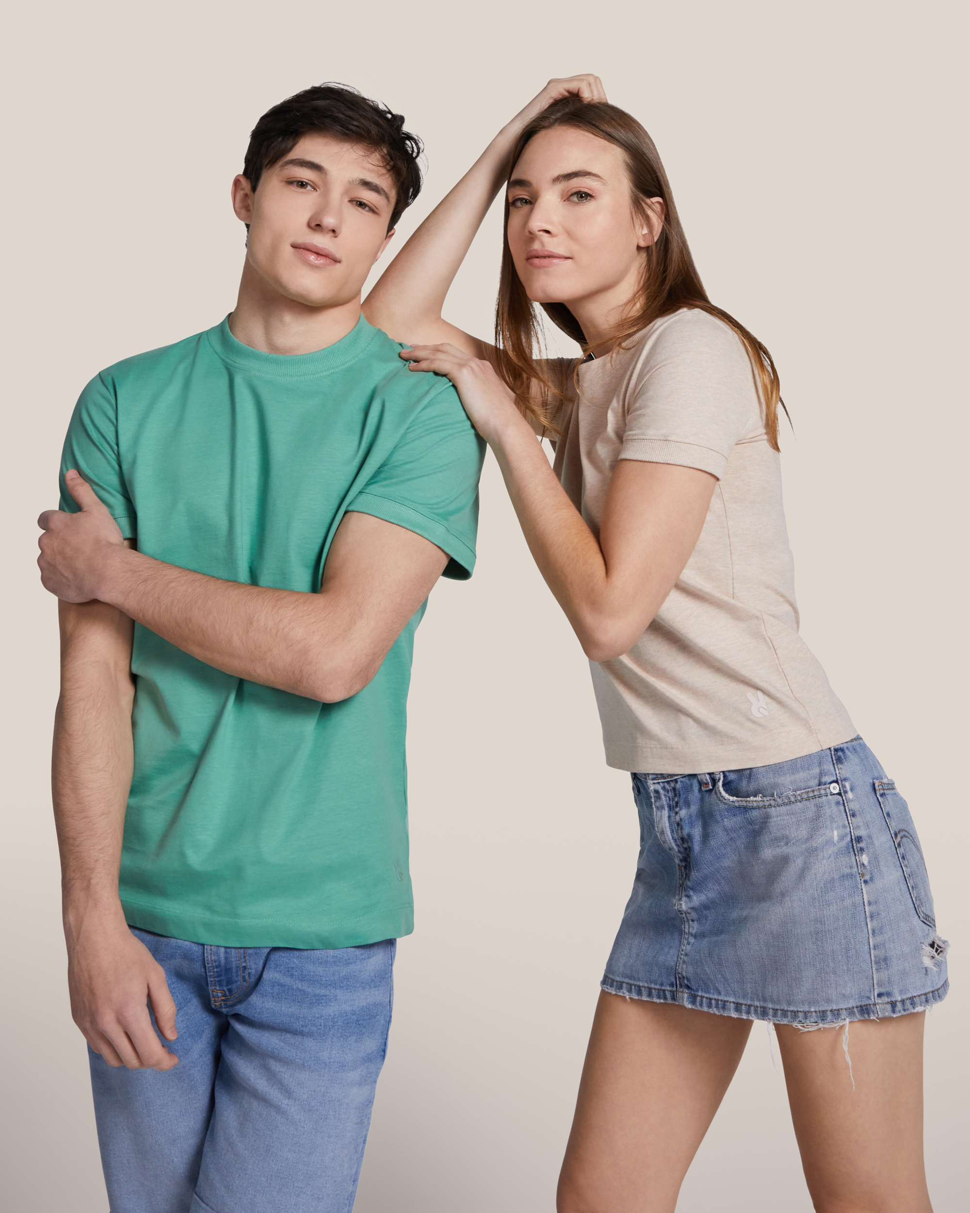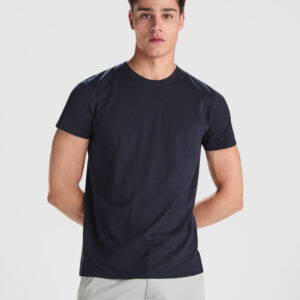 Camiseta gruesa de mujer en manga corta de algodón. Cuello redondo y ribete mangas en canalé ancho 2×1. Cubrecosturas reforzado en cuello. Costuras laterales. Logo Roly a tono en bajo lateral izquierdo. Costura ancha en el bajo.