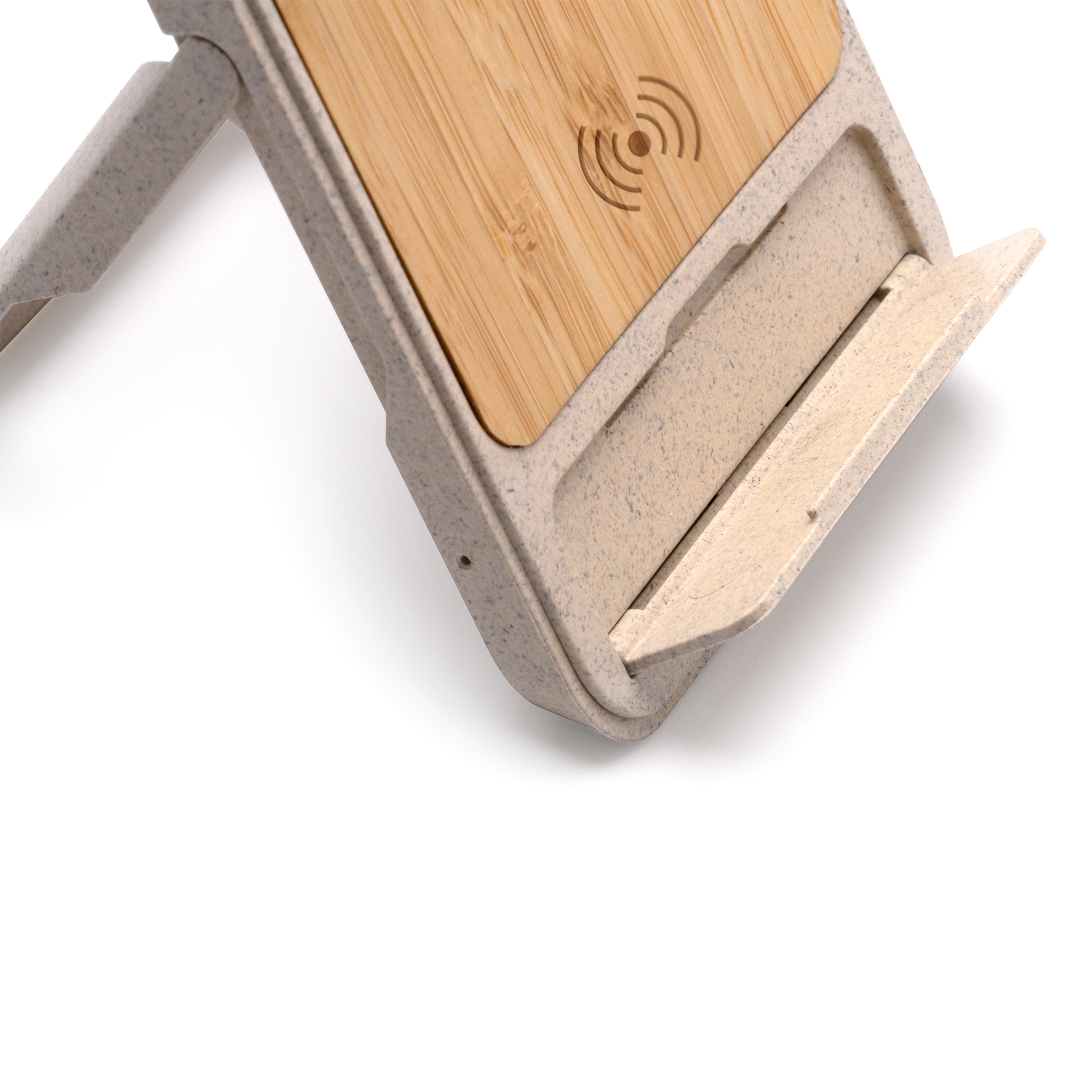 Cargador inalámbrico con cuerpo elaborado en fibra de trigo y superficie de carga en bambú. Con soporte extensible para situar el smartphone y en la parte trasera para posición vertical. Potencia de carga de 15W. Compatible con dispositivos provistos de tecnología compatible con este tipo de carga. Cuenta con puerto de entrada tipo C para conexión e indicador luminoso de confirmación de carga.
