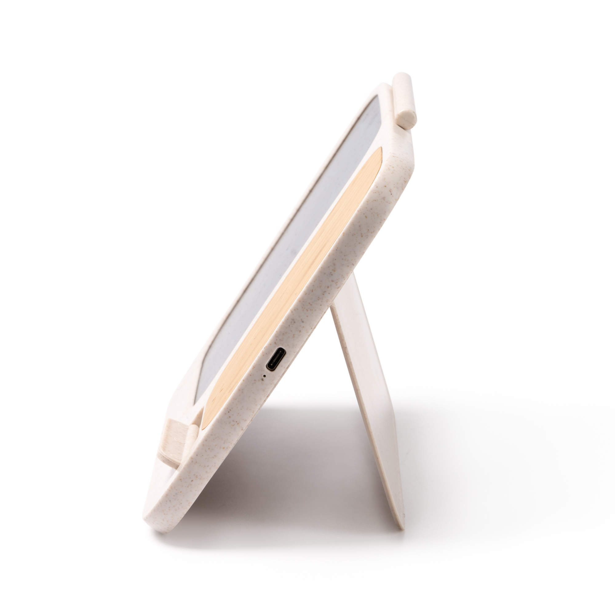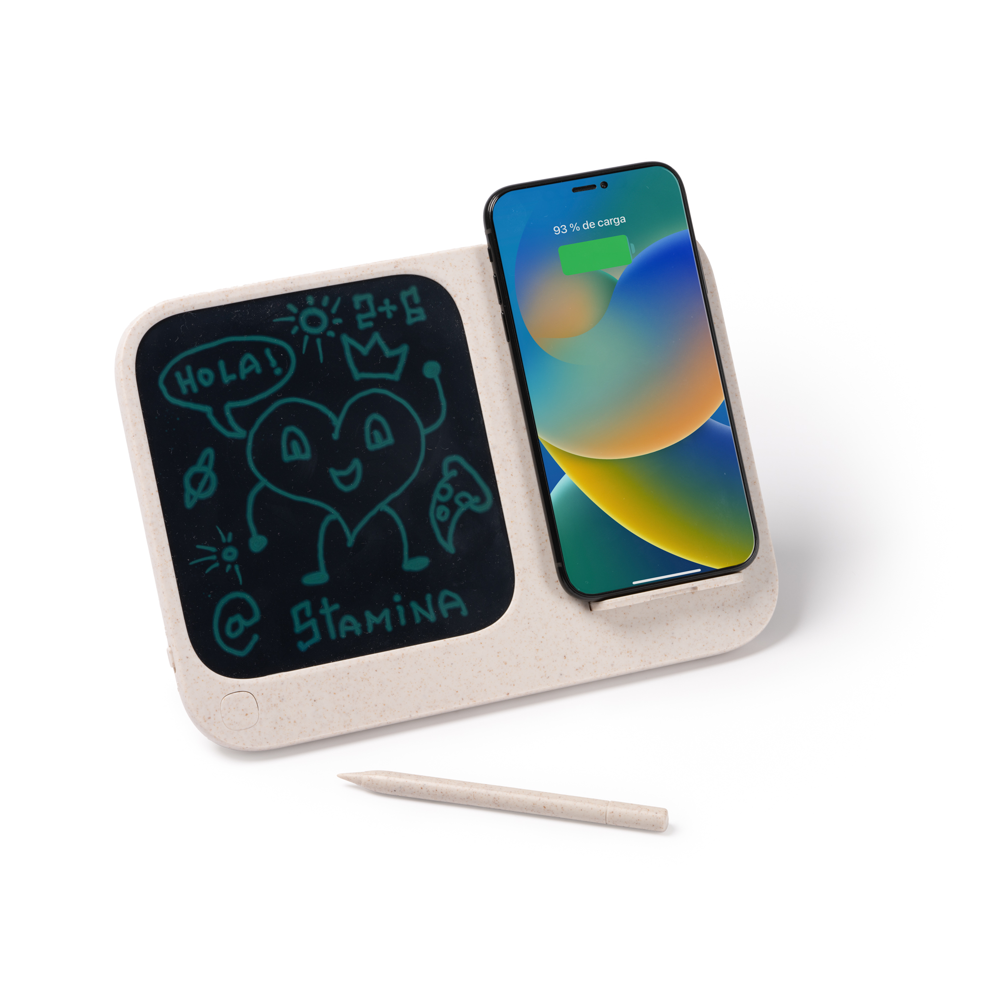 Pizarra digital de 6″, con cuerpo elaborado en fibra de trigo. Incluye superficie de carga inalámbrica en bambú de 15W de potencia. Incluye accesorio extensible como soporte de smartphone. Compatible con dispositivos móviles provistos de esta tecnología de carga. Cuenta con botón de borrado de pizarra y lápiz incluido.