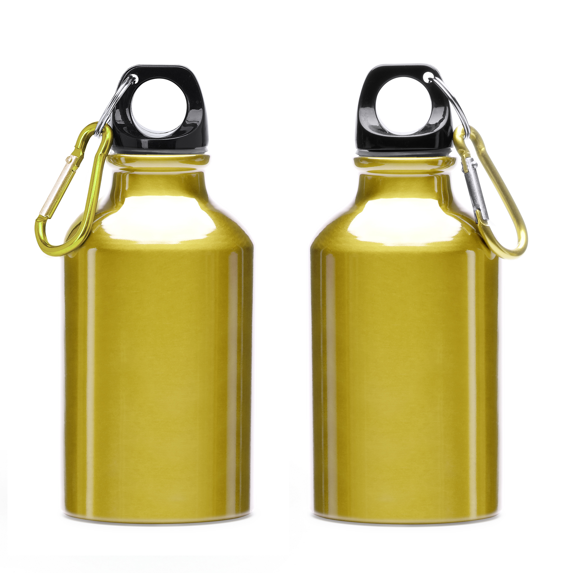 Bidón de aluminio con mosquetón. Tapón en color negro y mosquetón del mismo color metálico que la botella. Capacidad 330 ml. Su tamaño facilita que puedas llevarlo contigo siempre.