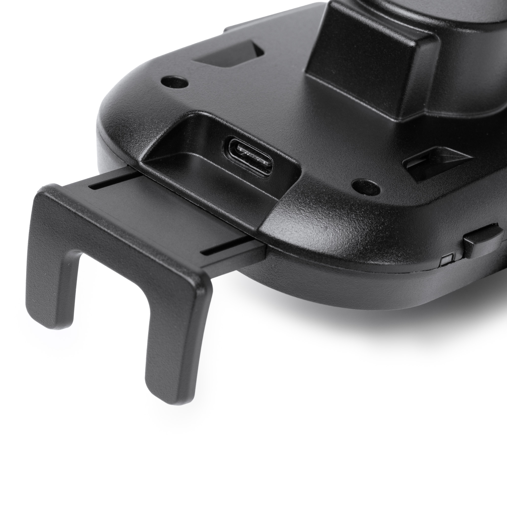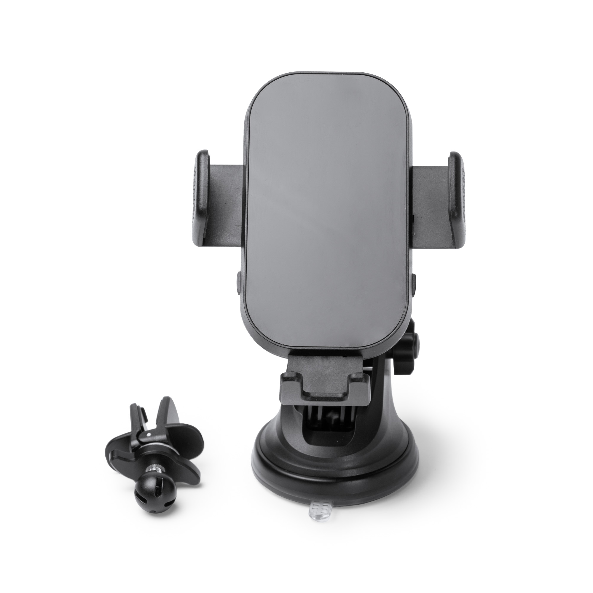 Soporte de coche para smartphone 2 en 1 con carga inalámbrica. Brazo extensible con ventosa y accesorio para rejilla ajustable incluidos. Ajuste lateral automático. Compatible con dispositivos con tecnología de carga inalámbrica. Potencia 15W. Presentación en caja diseño.
